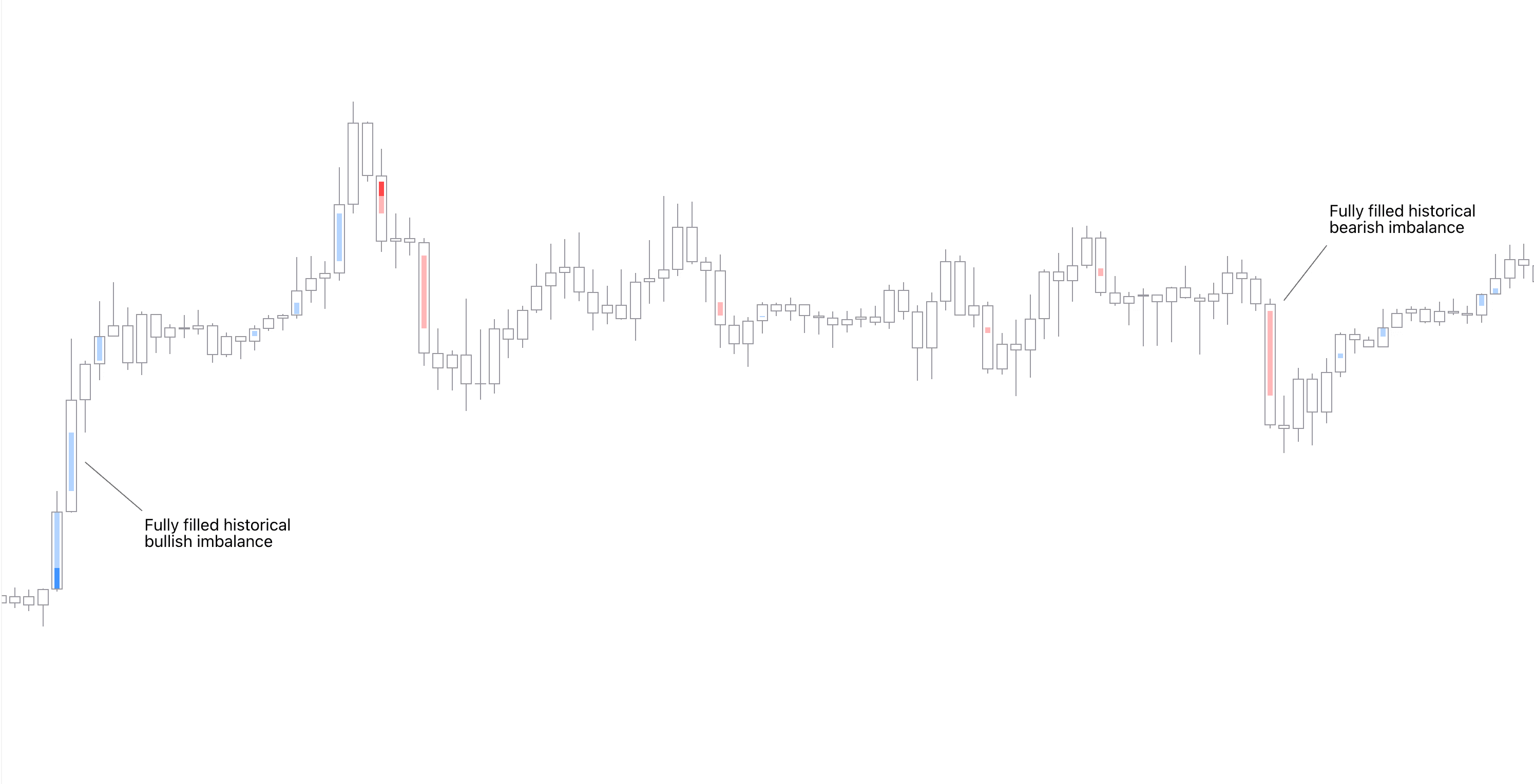 Imbalances that have yet to fully fill can be extended forward, revealing their filled and unfilled parts accordingly.