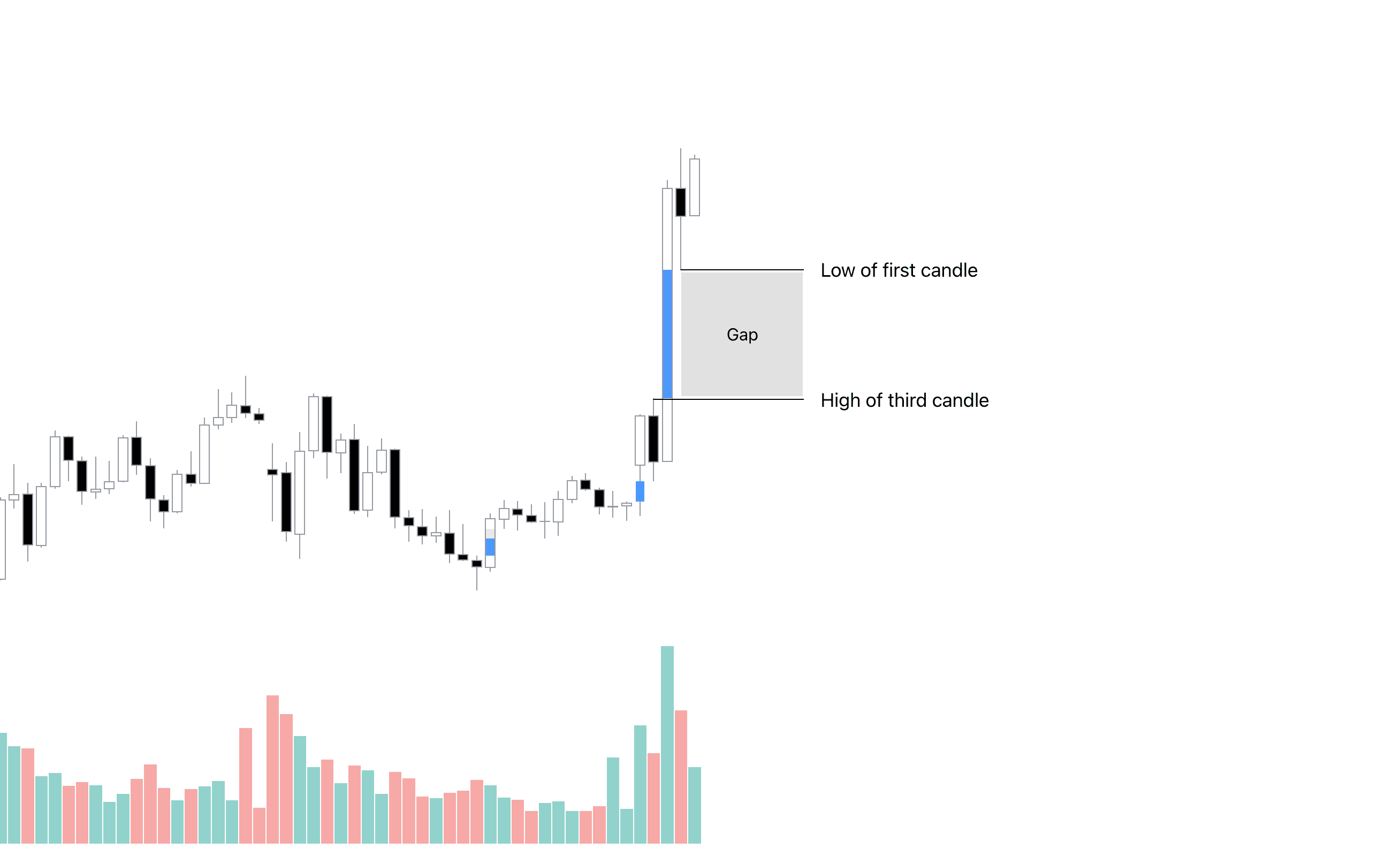 We can detect this pattern by looking for highs and lows of first and third candle that don't touch.