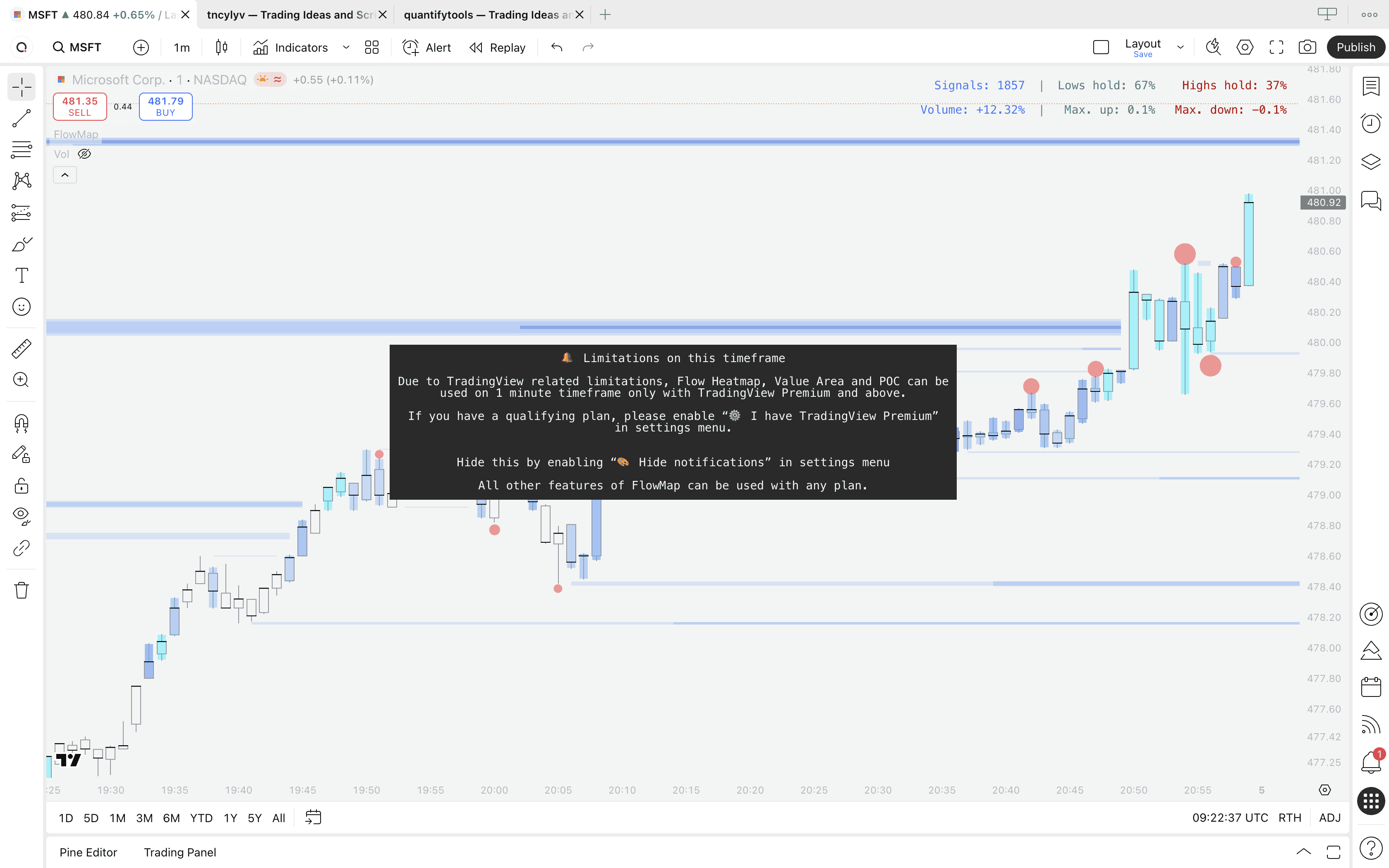 If you have a Premium or higher tier plan on TradingView, enable functionality on 1 minute timeframe by heading to FlowMap settings and enabling "I have Premium plan"